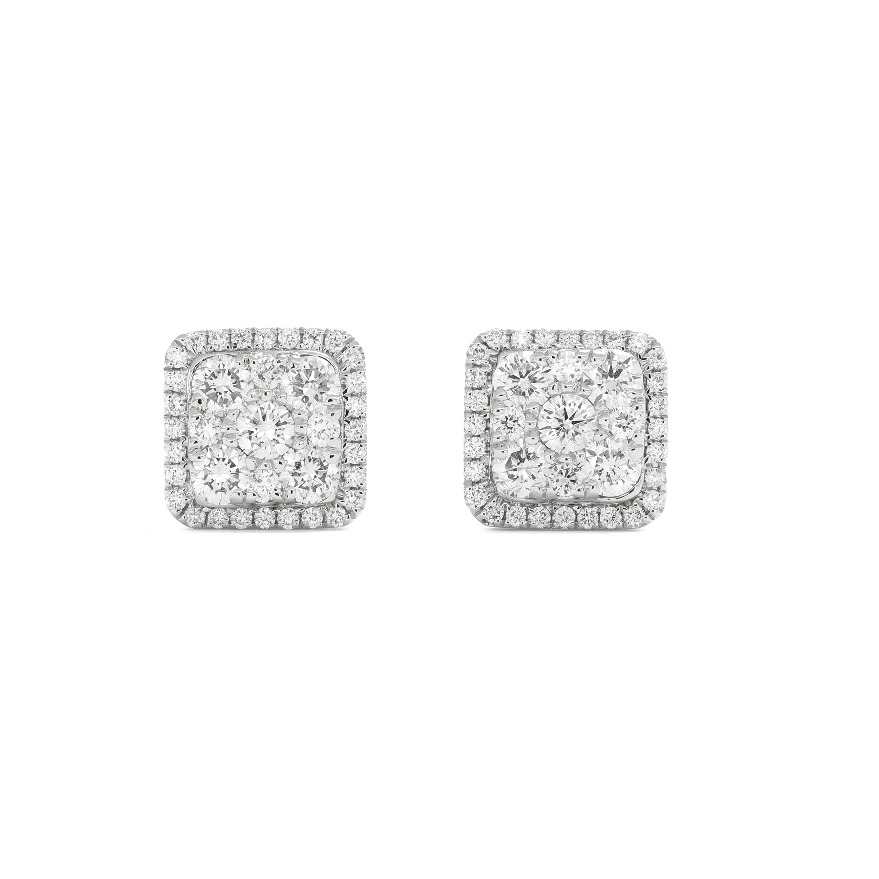 Each earring features round-cut diamonds arranged in a refined square cluster design, surrounded by a halo of sparkling diamonds that amplifies their brilliance and radiance.