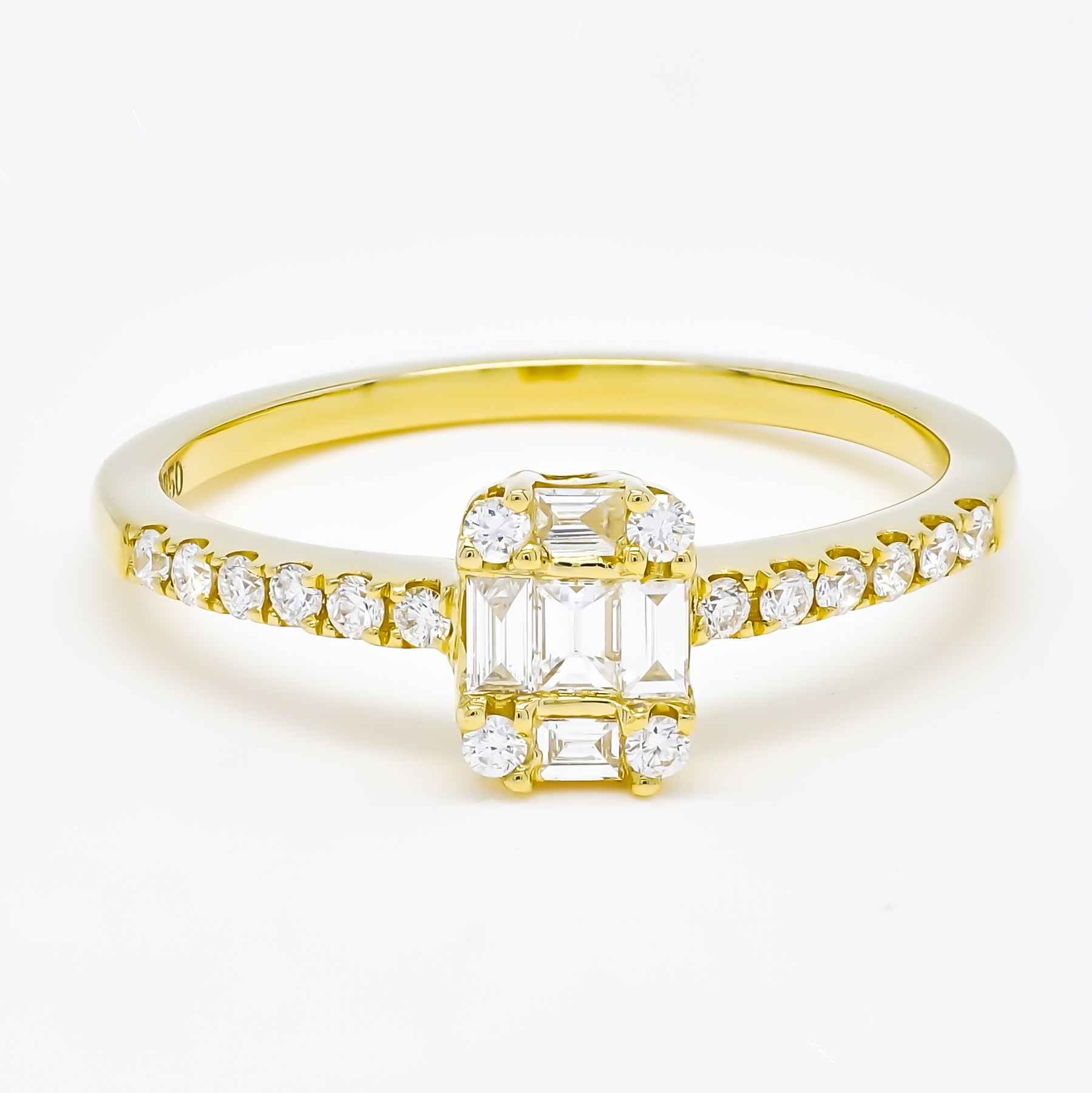 The ring features a cluster of diamonds in the center, which includes both round and baguette-cut diamonds, adding a unique and elegant touch to the design. The shanks of the ring are accented with additional smaller diamonds, which adds more sparkle and brilliance to the overall design.