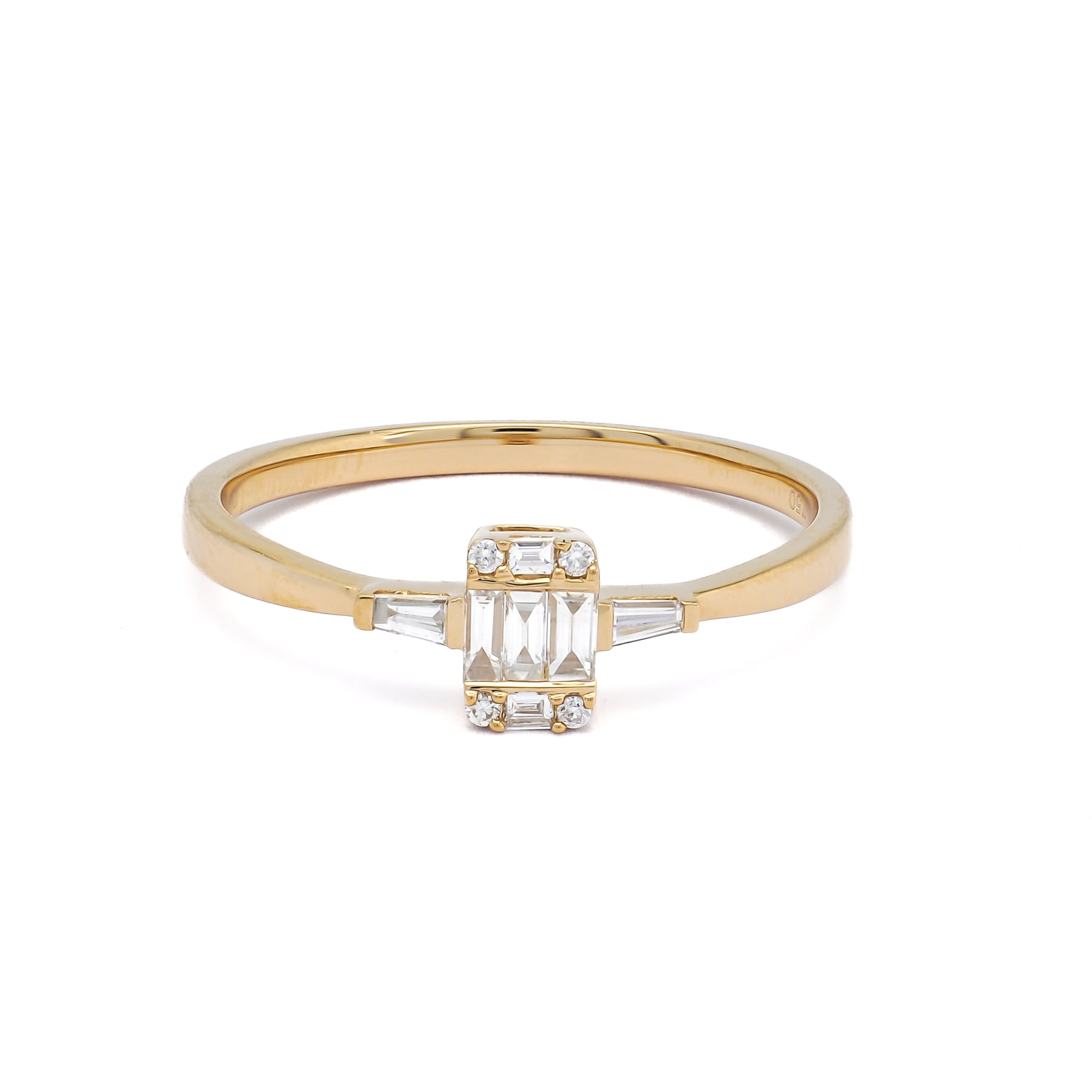 Featuring meticulously prong-set baguette diamonds, the ring’s captivating design showcases the diamonds arranged in a diagonal pattern, beautifully enhancing their brilliance. Crafted in luxurious 18KT gold, this stunning ring features a pair of beautifully matched baguette diamonds, meticulously set to enhance their dazzling brilliance.